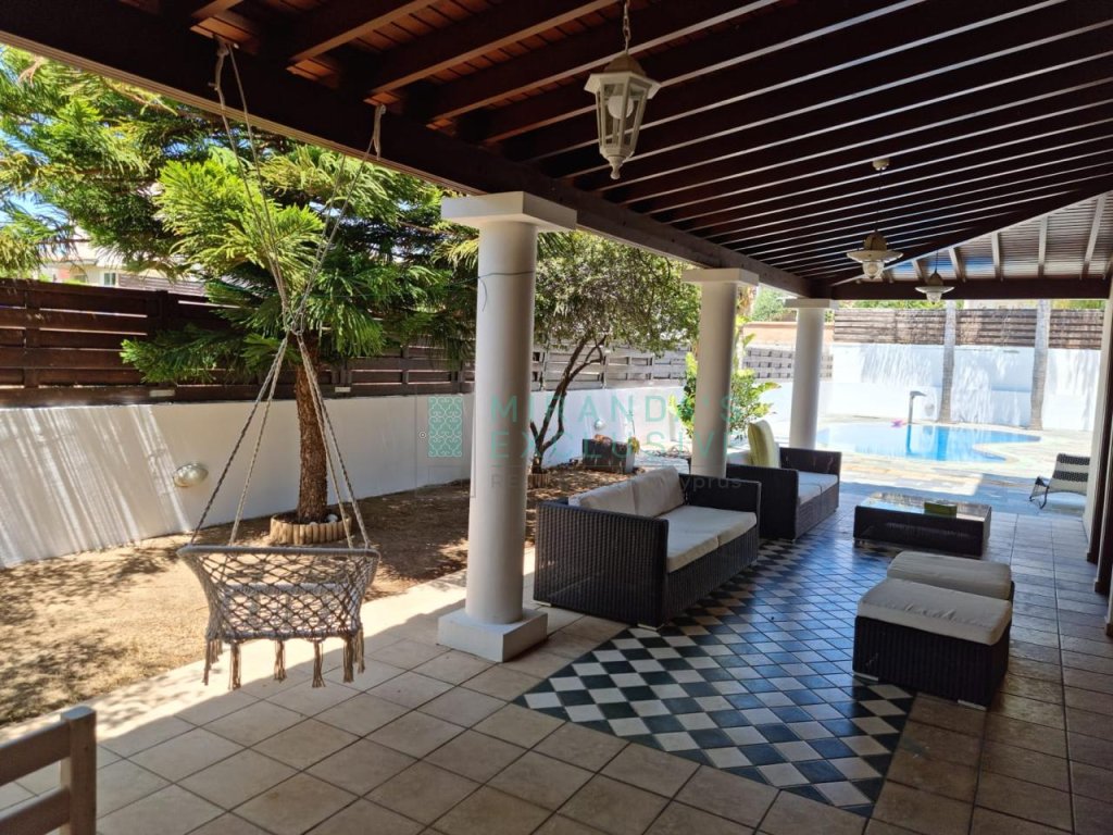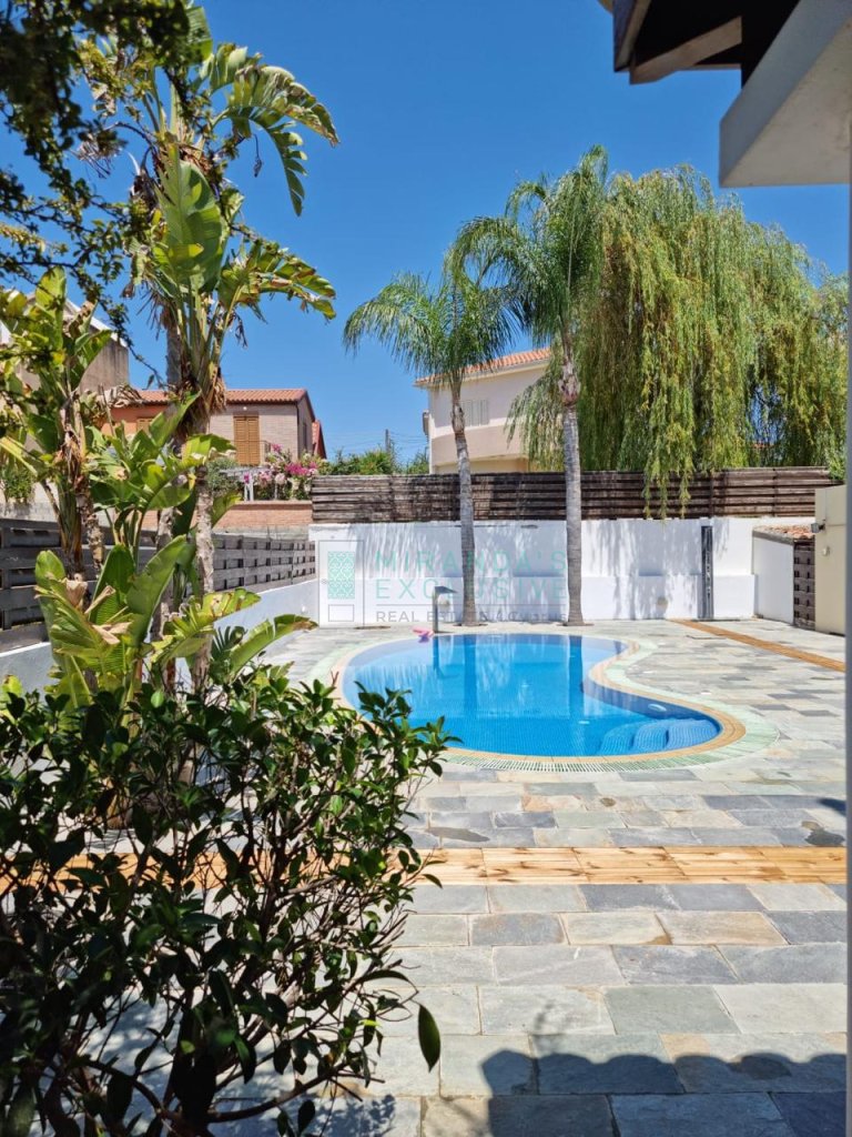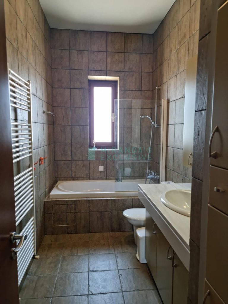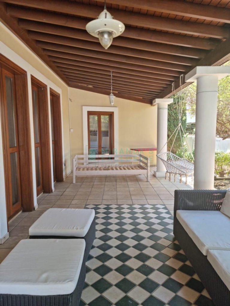 Located close to the American radio station in Makedonitissa, this beautiful villa is built on a large plot of 810 sm. It offers a swimming pool and plenty of covered and uncovered outdoor spaces with tall tress and mature plants for green and privacy. Around 430 sm of internal space, comprising 3 bedrooms/2 bathrooms on the first floor, a separate maid's room with private bathroom and private entrance on the ground floor, double living room with a fire place, dining room, separate playroom, fully equipped kitchen and a guest WC. Air conditioned throughout and a central heating system in place. Built in 2003, kept in immaculate condition. It comes fully furnished!