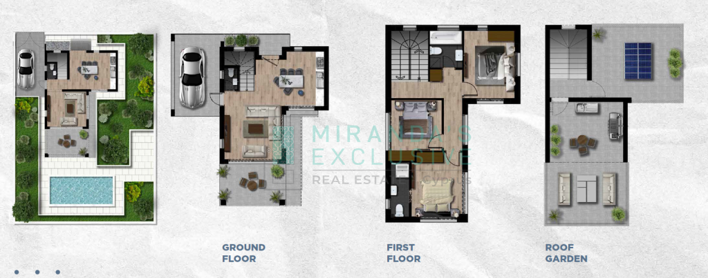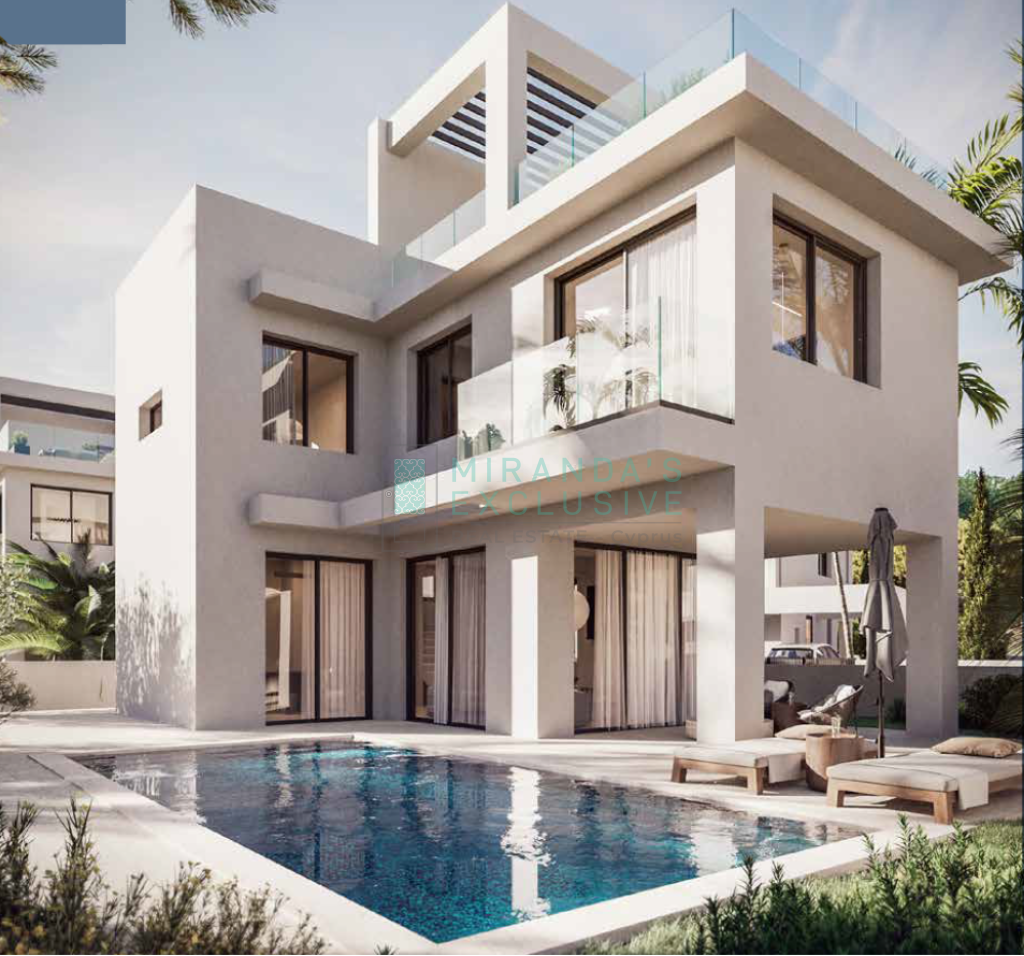 Situated in the cosmopolitan seaside resort of Protaras, renowned for its award-winning beaches ranking among the best in Europe, near the new Paralimni Marina, this stunning development embodies 180 sm of luxury. This 3 bedroom villa presents an excellent opportunity for both investment and home ownership. Each villa features a private swimming pool, garden, and a roof garden with captivating sea views. Photovoltaic panels included in price. 3 bedrooms, 2 bathrooms plus a guest WC, with the roof garden offering beautiful sea views. The ground-floor covered terraces seamlessly merge indoor and outdoor spaces, establishing an inviting environment to enjoy the Mediterranean climate of Cyprus all year round. Exclusively offered by Miranda’s Exclusive.