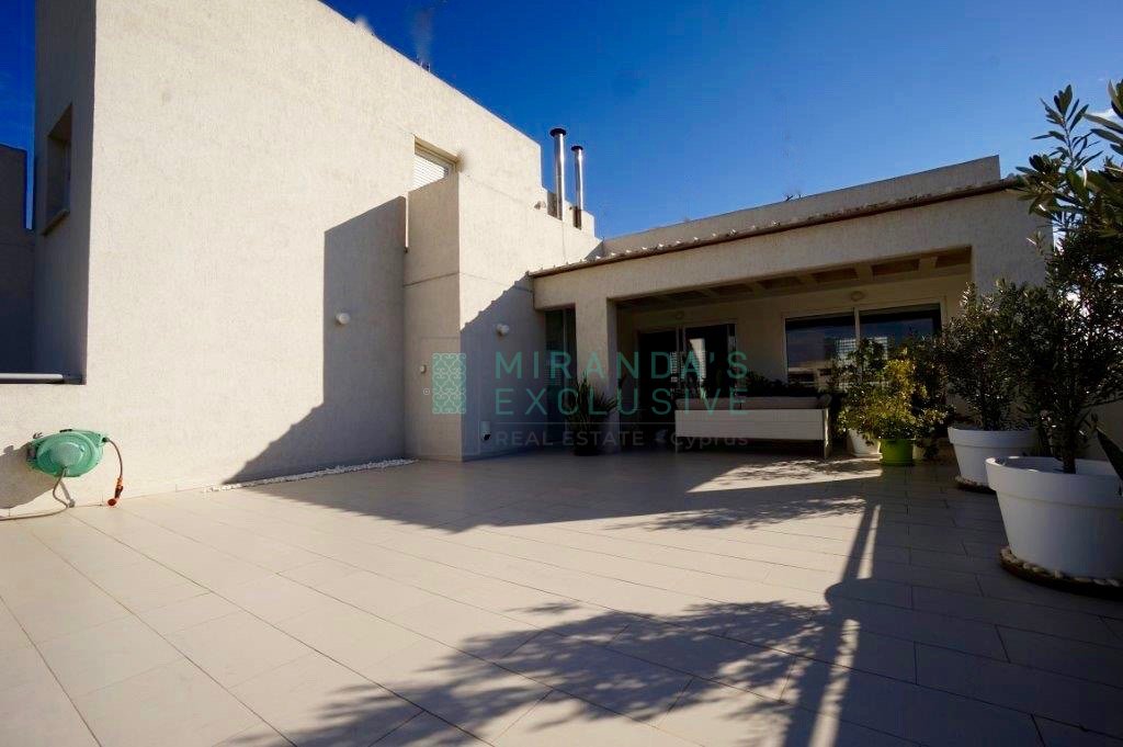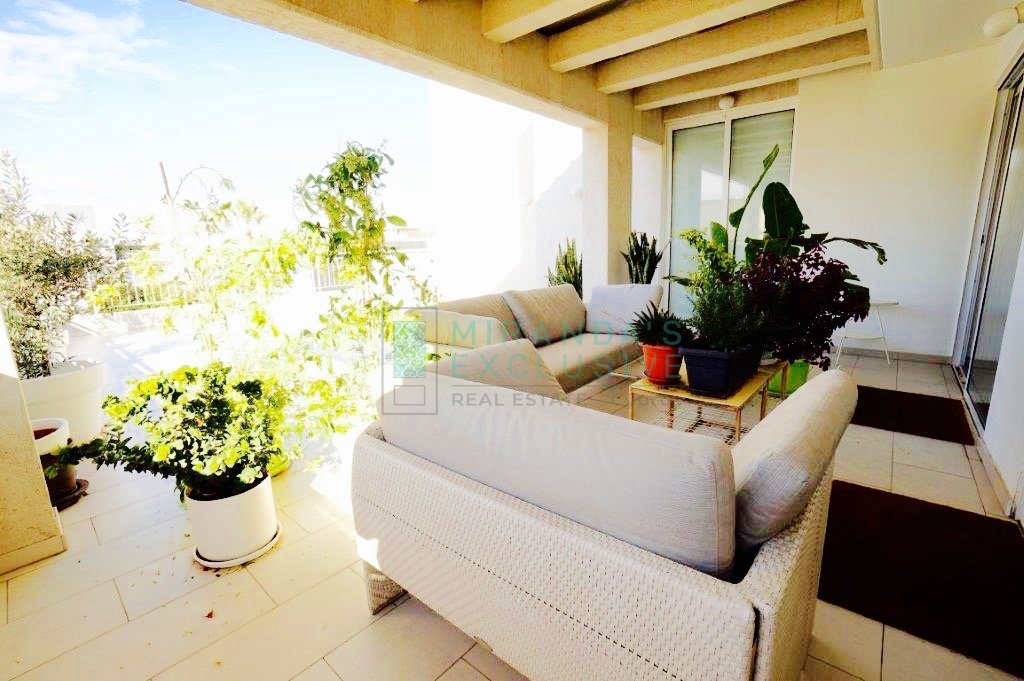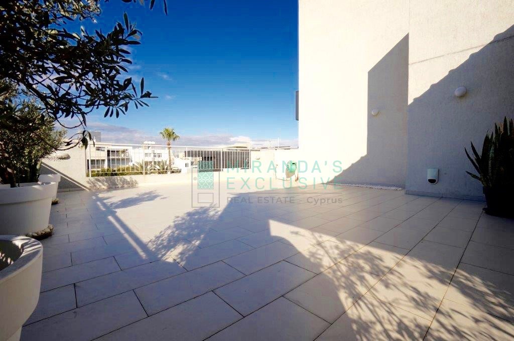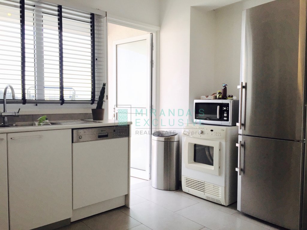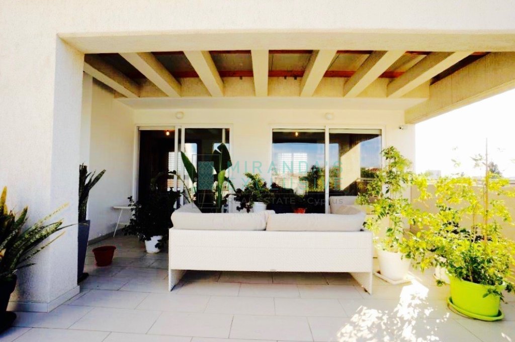 Luxury fully furnished whole floor flat on the top floor of a 3 floor building situated in Strovolos (Costa Theodorou area). It consists of a living/dining room, opening up to a huge veranda of 70 square meters, partly covered. Separate kitchen with all electrical appliances including even dish washer, coffee machine, tumble dryer and microwave. Master bedroom en suite with shower, plus a full bath to service the other 2 bedrooms and an extra guest wc. Expensive and elegant pieces of furniture throughout, the flat comes complete with solar panels, alarm, autonomous petrol central heating, air conditioning units, covered parking space and store room. The price is negotiable but does not include common expenses of 57 euro per month. Pets not allowed! . Large verandas. Fully equipped kitchen with German appliances: Neff, Whirlpool. Washer, drier, dishwasher, oven, electric cooker, microwave, fridge, coffee-maker. Dedicated covered parking. Separate storage room. Water pressure system. Internet and cable TV throughout. Structured cabling system. Entrance/garage. Close to shops and schools. 120 sq.m. plus 70 sq.m. verandas . CCTV with cameras in every room. Modern system with remote access. Alarm system.