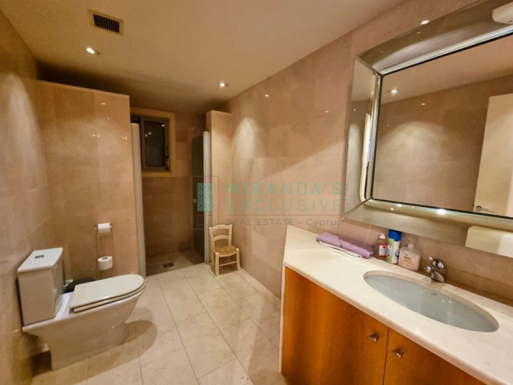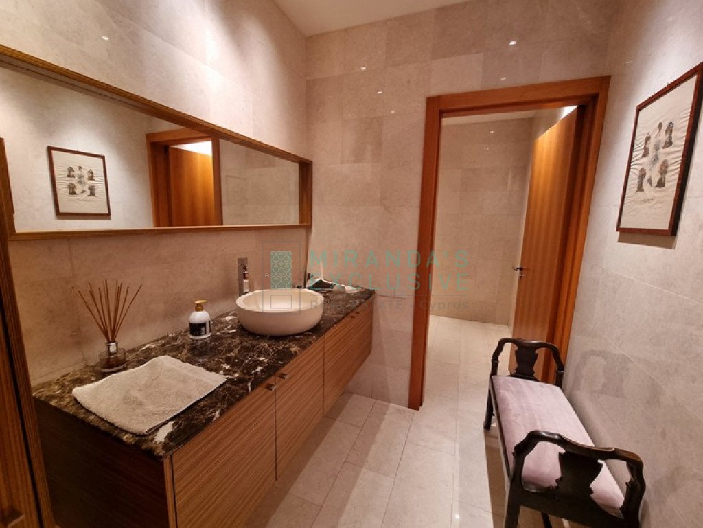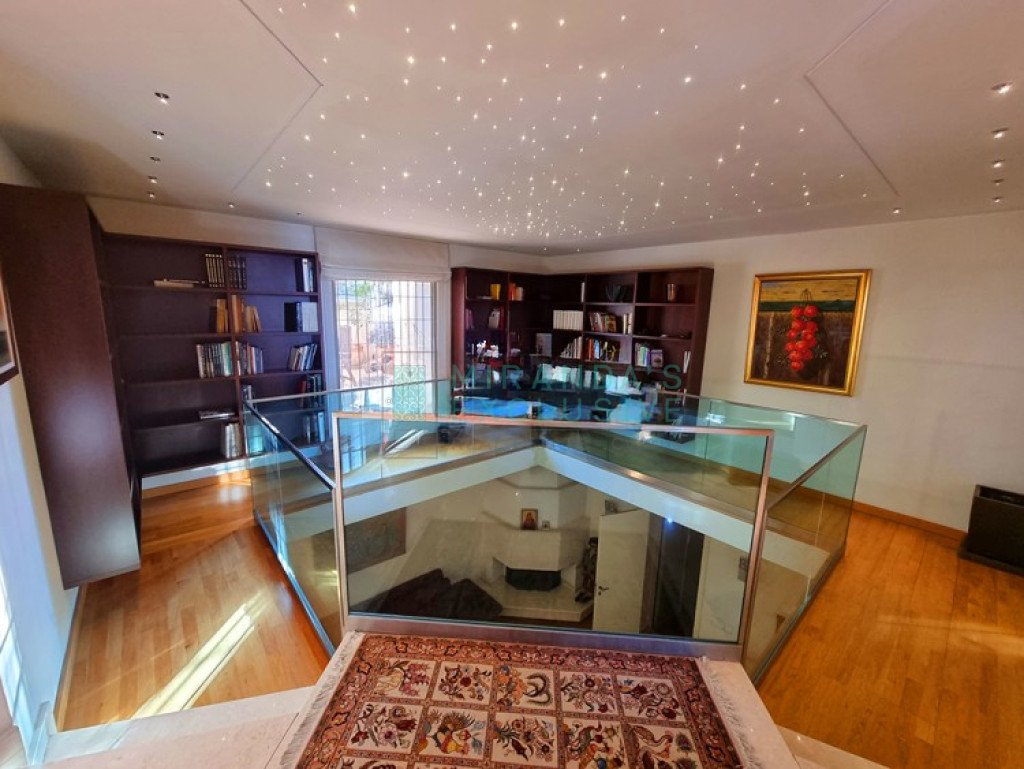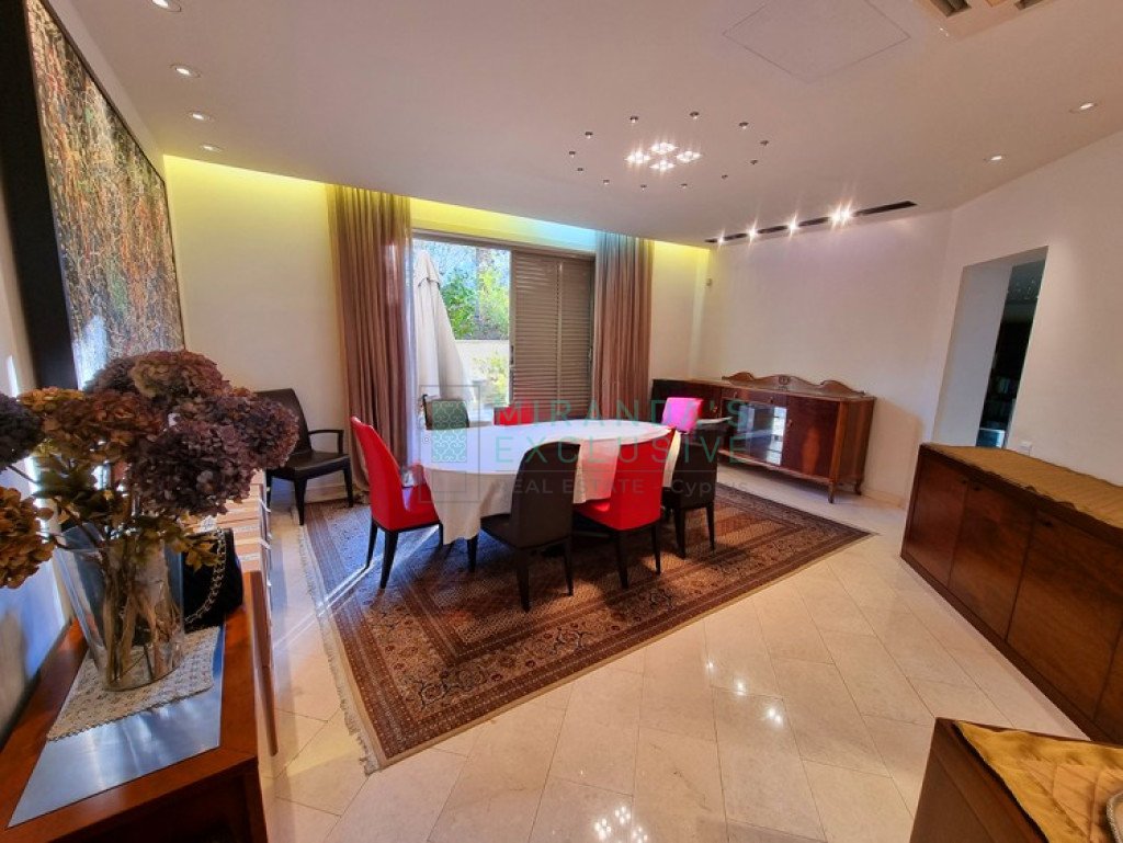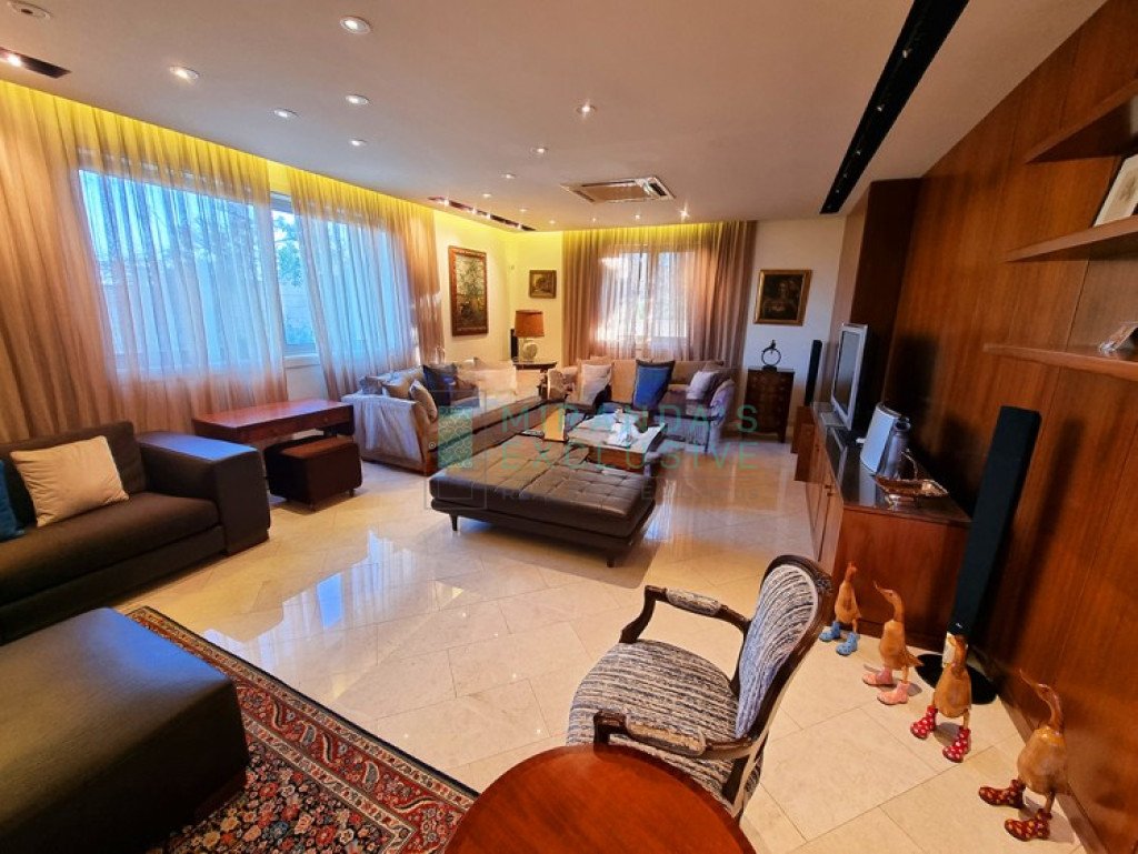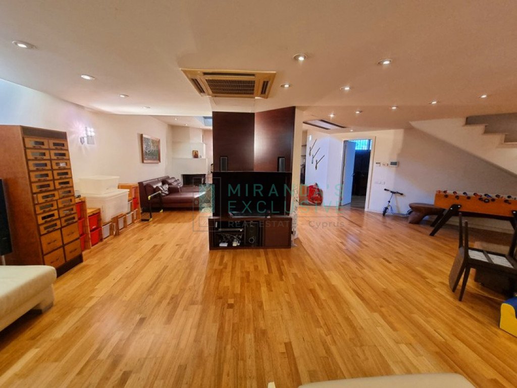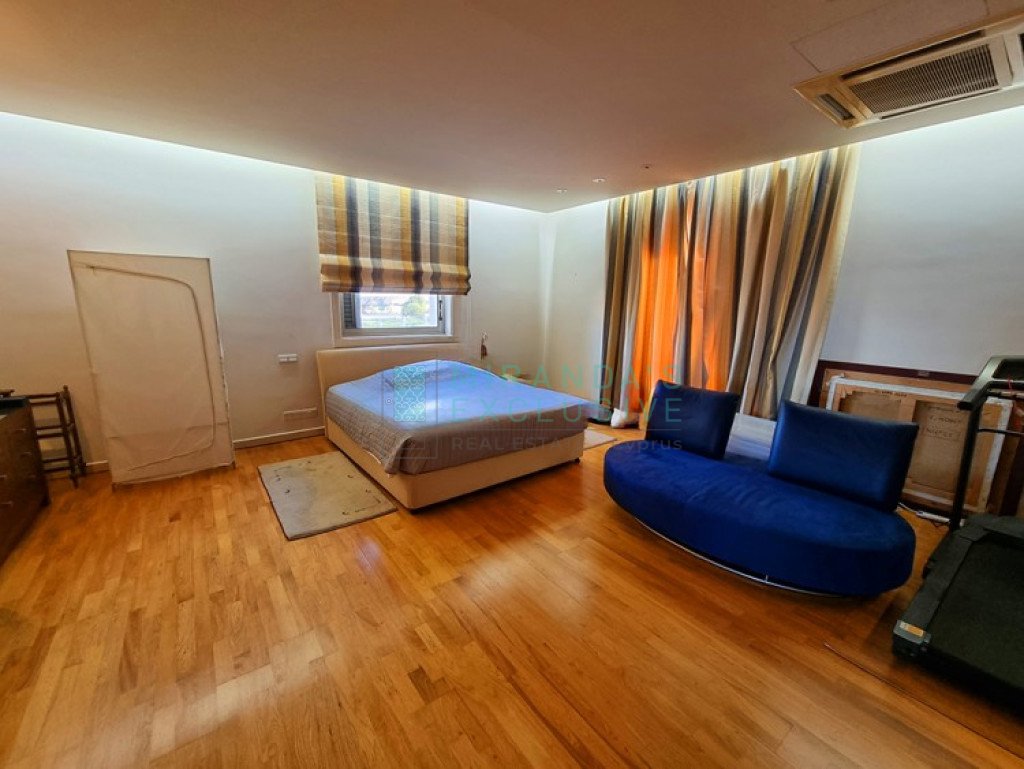 This is a luxurious modern style detached villa in Ilioupolis (near Carlsberg) with high end finishes. The villa is set in a double sized plot 1.008 sqm with amazing surrounding gardens. It is located in a very quiet hill location with excellent access to the highway and is close to shops, schools (Senior School, Forum). The property is on 3 levels with an elevator and offers living accommodation of 975 sqm. In the basement area there is an extra living room area with a separate office and TV room, bar, WC, maids room, laundry and storage rooms. The ground floor comprises a large luxury fitted kitchen sitting and dining area, a large formal dining room, a 2 spacious main living room with recessed lighting and a guest toilet. The upper floor consists of a large master suite with en-suite bathroom, walk-in shower and a corner bath. It also features a separate dressing area with walk-in closet and fitted wardrobes and also another 3 spacious en-suite bedrooms. The house also has an extra very spacious attic. Under floor heating and central air conditioning. The villa has a 5KW solar panel system installed and a spacious garden area . The house can be rented furnished or unfurnished.